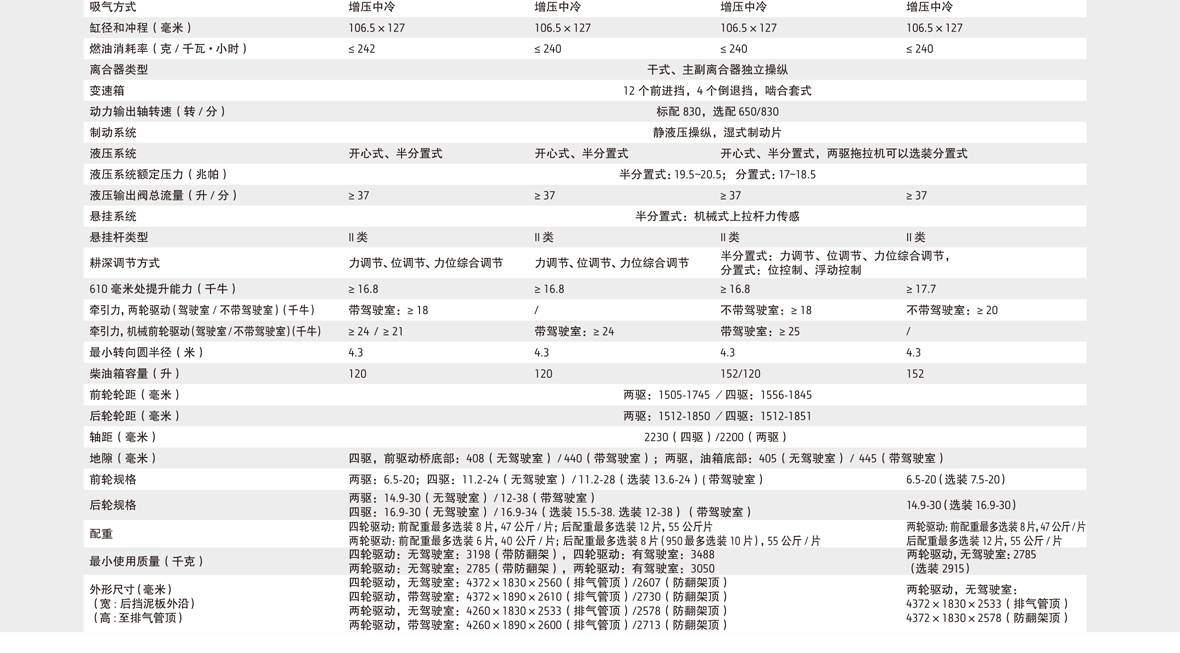 功能強大:采用迪爾公司設計的嚙合套換擋變速箱,具有12個前進擋、4個倒擋;擋位、速度分布合理。駕駛員可以根據作業的不同情況、配帶農機具的不同、車速的變化、地面的坡度、作業土壤的比阻、牽引機具的大小,在較大的速度范圍內進行作業擋位的選擇,充分發揮出機器的性能。具有力調節和位調節功能,多功能液壓輸出裝置,水田作業防水性能好,燃油箱容量大,能 更好地滿足使用要求。