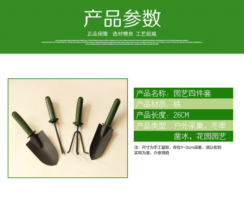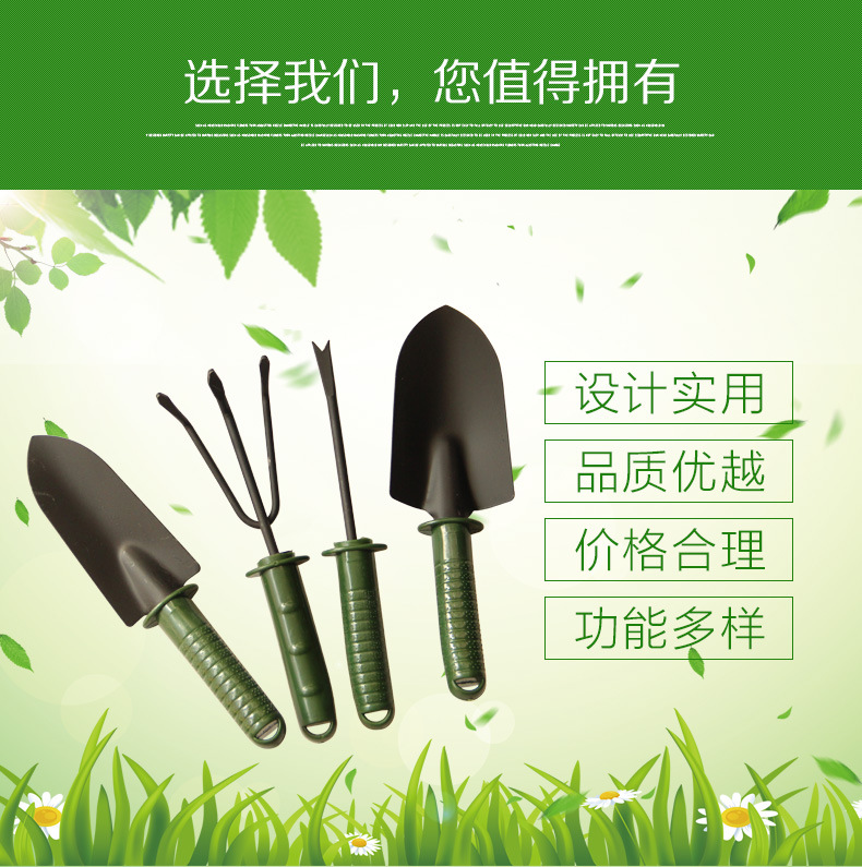 詳細信息 材質塑料把柄,鐵頭 貨號0002 是否進口否 類型鏟子 品牌春暉園林 適用場景園林園藝種植 規(guī)格綠柄四件套,綠柄三件套,軍綠大三件套 是否跨境出口專供貨源否 作用挖掘 主體材質鐵 是否可折疊否