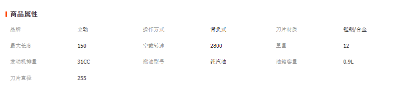 發動機型號:139FA/HS39發動機 形式:風冷單缸四沖程汽油機 排量:31CC 功率》0.7KW/6500r/min 發動機怠速:2800-3200r/min 化油器形式:膜片式, 油箱容積:0.9L 機油箱容積:0.1L 工作桿直徑:26mm