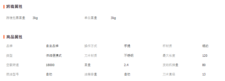 材質:不銹鋼+尼龍+ABS 裝箱數量:10臺 一箱重量:23.5公斤 1臺重量:2.25公斤 彩盒規格:70.5*19*8CM 外箱規格:72*41*40cm 電池配送5個一盒.電池24V.毫安7500.mah 刀片配送3種.尼龍5片.金屬1+1片. 鋸片1片.適配器一個