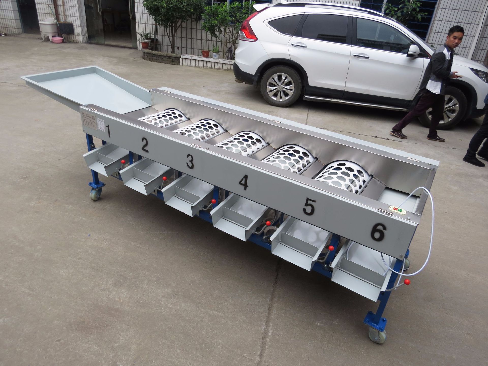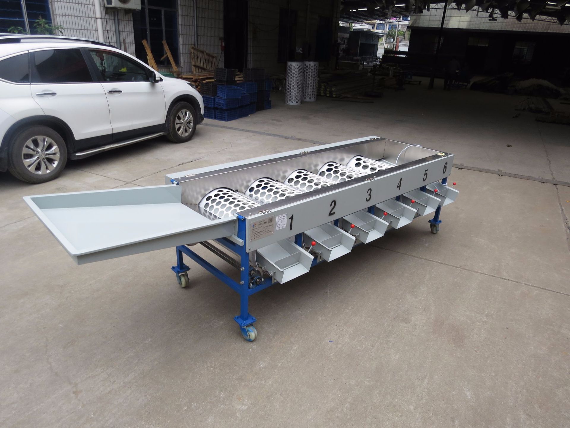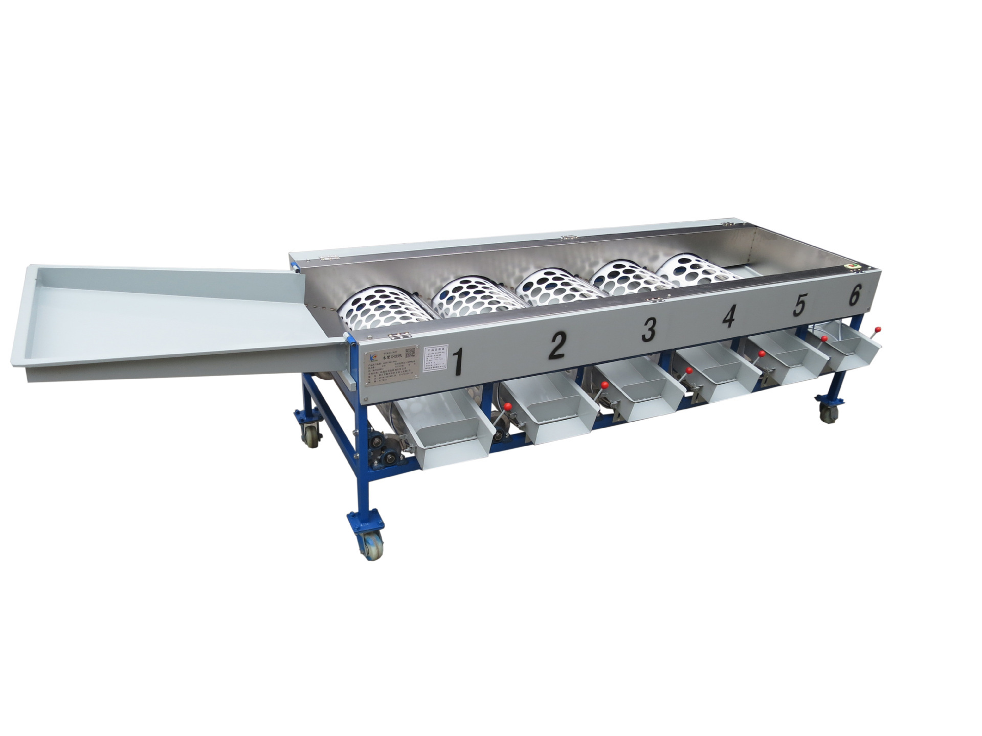 設備是由鐵板斗和分級機組成,分級機是5筒6級組成,根據果蔬的直徑來分選大小