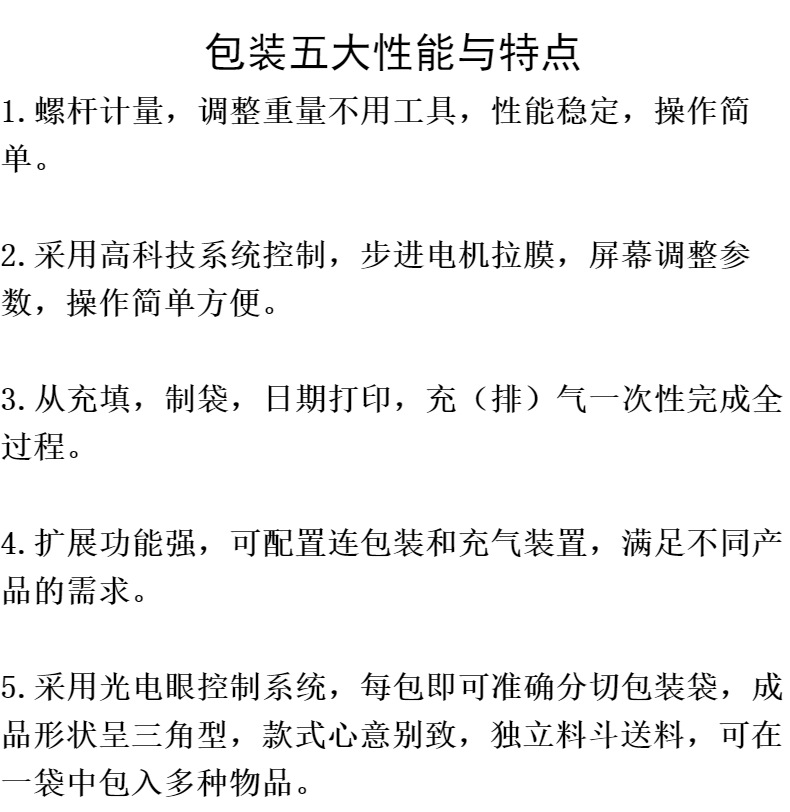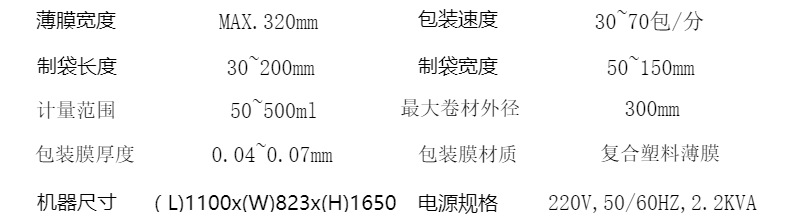 詳細信息 加工定制是 功能包裝容器成型,打碼、噴碼,灌裝,封口,充填,殺菌、干燥,打包,清洗,計量 品牌富佳麒 型號FJQ-160YT 電壓220(V) 功率2.2(Kw) 包裝膜寬320(mm) 制成袋尺寸(L)30~200*(w)50~150(mm) 包裝速度30~70(袋/分鐘) 重量300(kg) 外形尺寸(L)1100*(W)823*(H)1650(mm) 包裝材料復(fù)合材料 包裝類型袋 自動化程度全自動 適用對象小型液體 適用行業(yè)