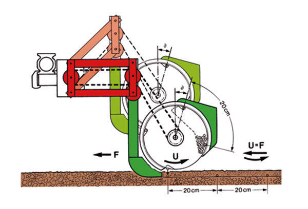 播種盤轉(zhuǎn)速與拖拉機(jī)行駛速度相同,方向相反,可實(shí)現(xiàn)零速落種,落地高度離地面僅3厘米,保證精確落種。