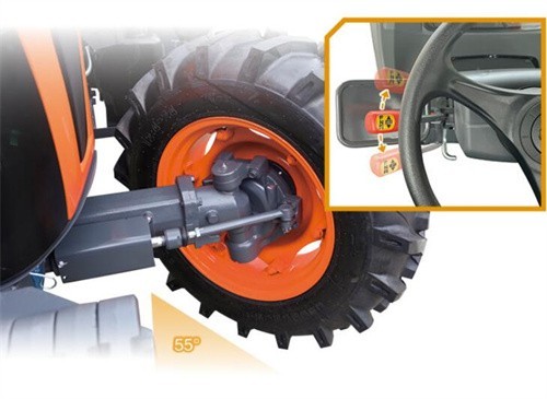 久保田拖拉機擁有55度大轉向角,轉彎更為快捷,縮短作業時間、降低燃油消耗、 提高工作效率。(注M854- KS(G4)和M854 -KQS(G4)的最大轉向角為50度)