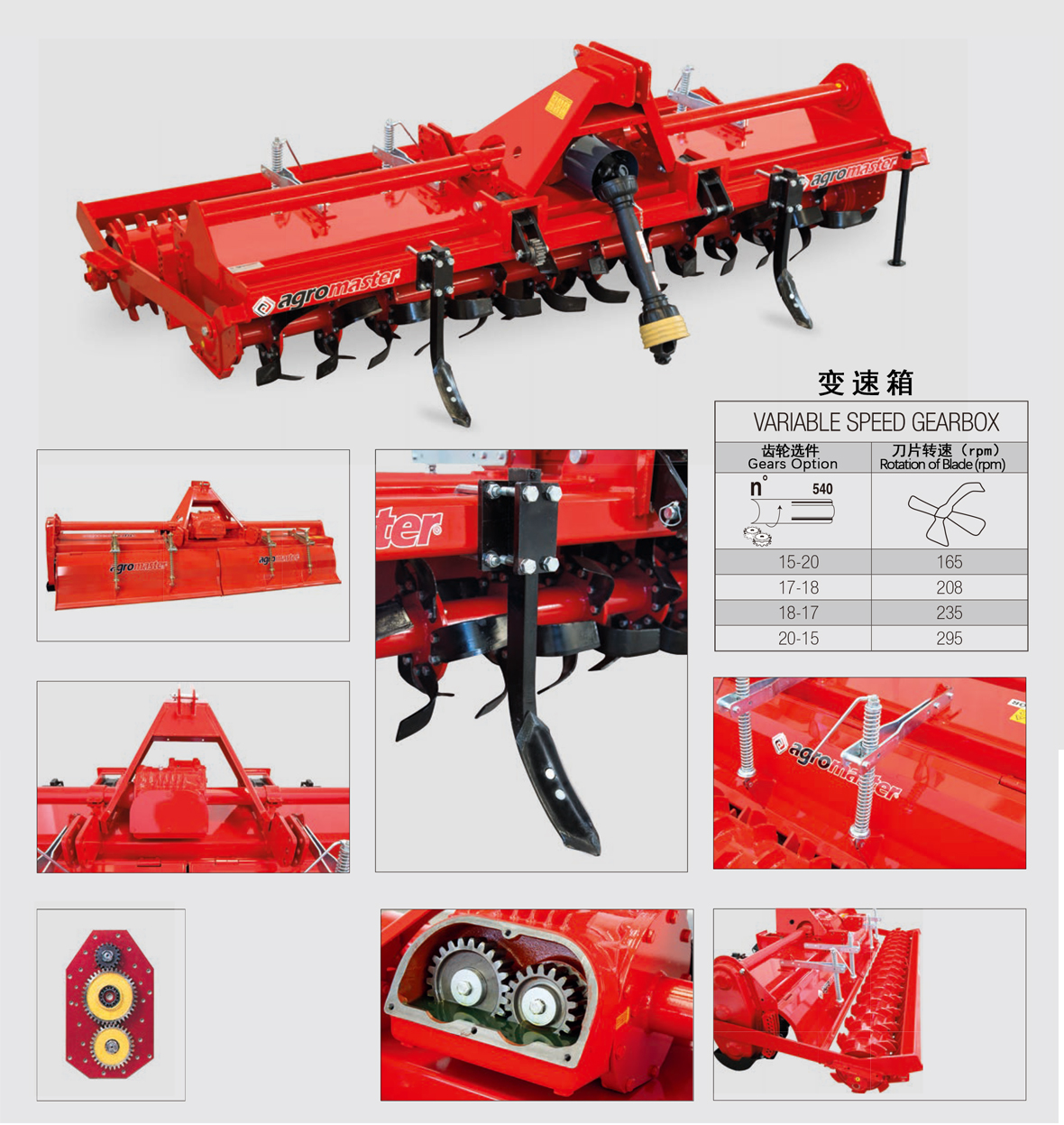 變速旋耕機配有變速齒輪箱選件。動力輸出通過變速箱中齒輪的變速而獲得的運動使得可以不同地使用刀片的轉速;