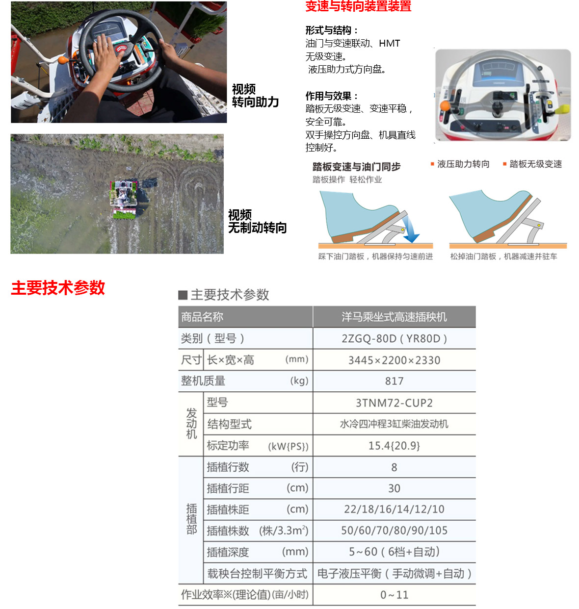 1、洋馬國“Ⅲ”排放 3TNM72型柴油發動機,動力穩定可靠; 2、配置高效HMT行走變速箱(液壓變速+齒輪傳動),比傳統HST變速箱傳動效率高15%; 3、栽秧臺水平控制裝置(UFO),保持秧臺在水平狀態下作業,使栽幅內插秧深度穩定均勻; 4、高速仿形插植機構,高速取秧不傷秧,高速插秧不推秧,保證插秧良好的直立性; 5、插秧深度自動補償,油壓感度裝置,準確控制插秧深度; 6、踏板變速,方向助力,轉向對行操控便捷; 7、主要技術參數