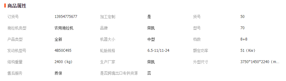 商品描述 40-220馬力拖拉機、所配國三動力柴油機,耗油少,噪音低,易啟動,適用于平原、蔬菜大棚、果園、坡地、梯田等大型農業機械難以作業的地方,配套不同農機具可以完成不同的農藝作業。旱地播種或水田栽插的要求可分2輪驅動和4輪驅動,拖拉機可配套40多種農機具能夠完成旋耕、除草、開溝、培土、起壟、埋溝、埋藤、覆膜、犁耕、播種、施肥、抽水、噴藥、運輸、土豆割秧、土豆收獲、花生收獲、大蔥收獲、水田作業等。