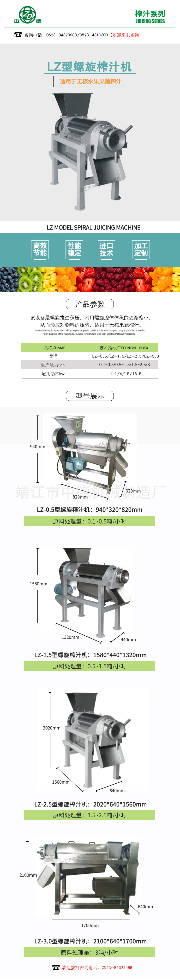 工作原理:破碎后的果肉、汁、皮通過(guò)進(jìn)料斗進(jìn)入雙螺旋榨汁機(jī),由于螺旋沿著料渣出口方向底徑逐漸加大而螺距逐漸減少,當(dāng)物料被螺旋推進(jìn)時(shí),因螺旋腔體積縮小,形成對(duì)物料的壓榨。螺旋主軸的轉(zhuǎn)動(dòng)方向從進(jìn)料斗向渣槽方向看去,為逆時(shí)針方向。原料加入進(jìn)料斗中,在螺旋的推進(jìn)下受壓,其壓榨的汁液通過(guò)過(guò)濾網(wǎng)流入底部的盛汁器,而廢料則通過(guò)螺旋及調(diào)壓的錐形部分之間形成的環(huán)狀空隙排出,調(diào)壓頭沿軸向的移動(dòng)并直接受液壓系統(tǒng)控制。調(diào)節(jié)液壓系統(tǒng)的壓力,即調(diào)整排渣的阻力,即可改變出汁率,但如果液壓系統(tǒng)壓力過(guò)大,在強(qiáng)力擠壓下,部分渣的顆粒會(huì)和汁一起通過(guò)過(guò)濾網(wǎng)被擠出,盡管出汁增加,但汁的質(zhì)量相對(duì)下降,液壓系統(tǒng)壓力的大小應(yīng)視用戶具體工藝要求而定。從而達(dá)到汁與渣自動(dòng)分離的目的。