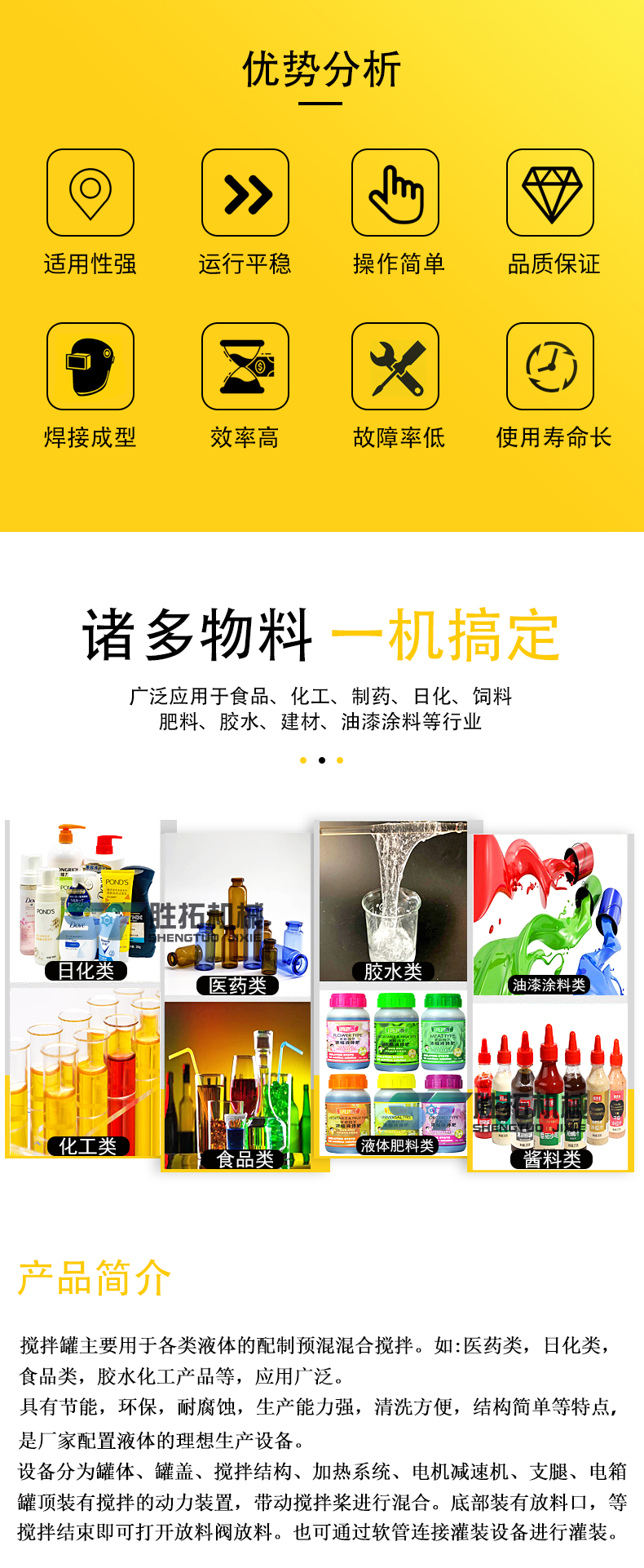 適用產品: 1.化妝品行業: 護膚膏,剃須膏,洗發膏,牙膏,冷膏,冷曬霜,洗面奶,營養密,洗滌劑,洗發水、發膏、護發素,精華液,保濕霜,護手霜等。 2.日化: 洗衣液生產,洗手液,潔廁凈,汽車玻璃水等。 3 .制藥工業: 乳膠,乳劑,藥膏(油膏),口服糖漿,口服液等。 4.食品工業: 醬類,乳酪,營養液,嬰兒食品,巧克力,糖類等。