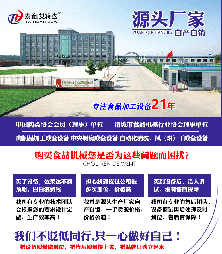 諸城市泰和食品機械有限責任公司于2001年注冊,是中國肉類協會會員理事單位,專業從事食品加工機械開發、設計、制造及銷售的企業。