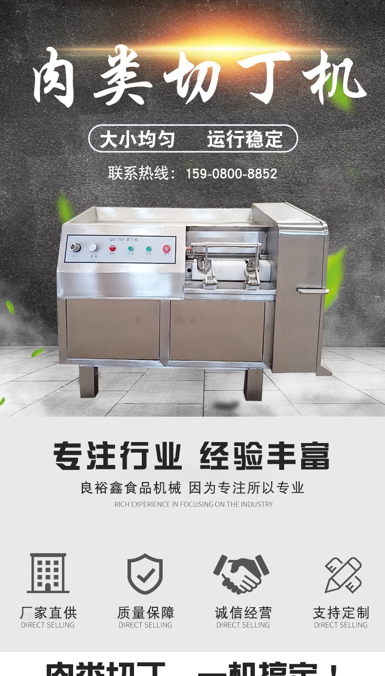 雞鴨肉牛肉筋羊豬肉大型全自動(dòng)切丁切條切片機(jī)。 該切丁機(jī)能精確切割到最小3mm,最大30mm,可切割不同的“片、塊、丁、條”等,是食品廠加工切、割方面的首選設(shè)備。切丁機(jī)是借鑒國(guó)內(nèi)外先進(jìn)的機(jī)械設(shè)計(jì)理念,并結(jié)合我公司現(xiàn)有產(chǎn)品生產(chǎn)工藝要求自行研發(fā)設(shè)計(jì)的。在同類產(chǎn)品中具有穩(wěn)定性高、操作方便、產(chǎn)量大、能耗低等特點(diǎn)。該機(jī)能切割-1℃-20℃微凍肉、生鮮肉、熟肉、部分果實(shí)、蔬菜、海鮮及無(wú)骨禽類產(chǎn)品。