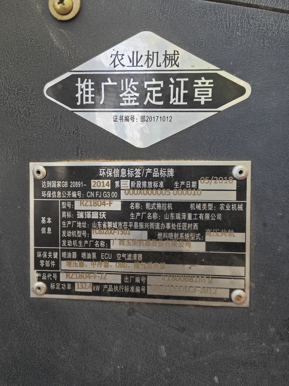 2018年二手瑞澤1804拖拉機玉柴發動機