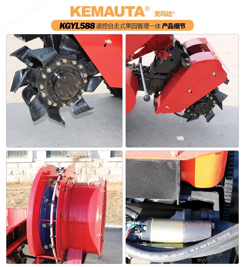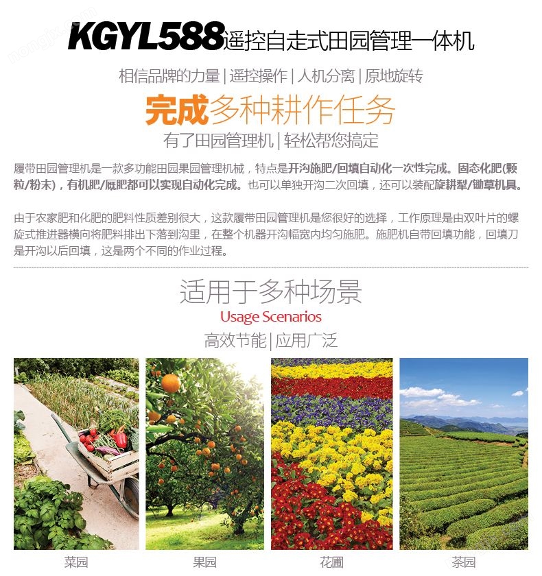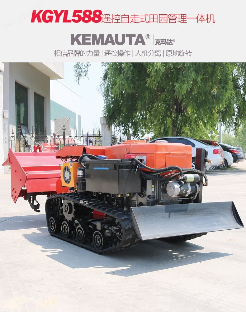 可遙控旋耕開溝施肥田園管理機KGYL588-3實現智能遙控操作,可實現轉向、停止與行走、機具升降功能,適合果園和大棚作業時空間受限和對人身有危害的特殊環境作業;整機尺寸緊湊,產品體積小,樹叢間通過性能好,操作靈活;采用履帶式行走設計,坡地、坑洼地通過性能強,抓地能力強、牽引力大;采用6+2低速變速箱(帶高低速),性能穩定、操作方便、可滿足不同作業環境及佩戴機具的作業需求。