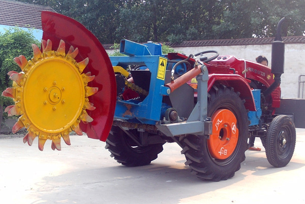 圓盤式開溝機(jī)是開挖溝渠一次成形的重要施工機(jī)械。其主要由動(dòng)力系統(tǒng)、減速系統(tǒng)、鏈條傳動(dòng)系統(tǒng)和分土系統(tǒng)組成。柴油機(jī)經(jīng)過皮帶將轉(zhuǎn)動(dòng)傳遞到離合器后,驅(qū)動(dòng)行走變速箱、傳動(dòng)軸、后橋等來實(shí)現(xiàn)鏈條式開溝機(jī)的向前或向后的直線運(yùn)動(dòng)。開溝機(jī)用于建筑工程中開挖窄而深的地下溝槽埋設(shè)地下排水管道、或鐵道、郵電、城建等部門用于埋設(shè)電纜與管道等,也可用于果園、蔬菜園以及其它農(nóng)田環(huán)境開溝施肥、排水、灌溉。