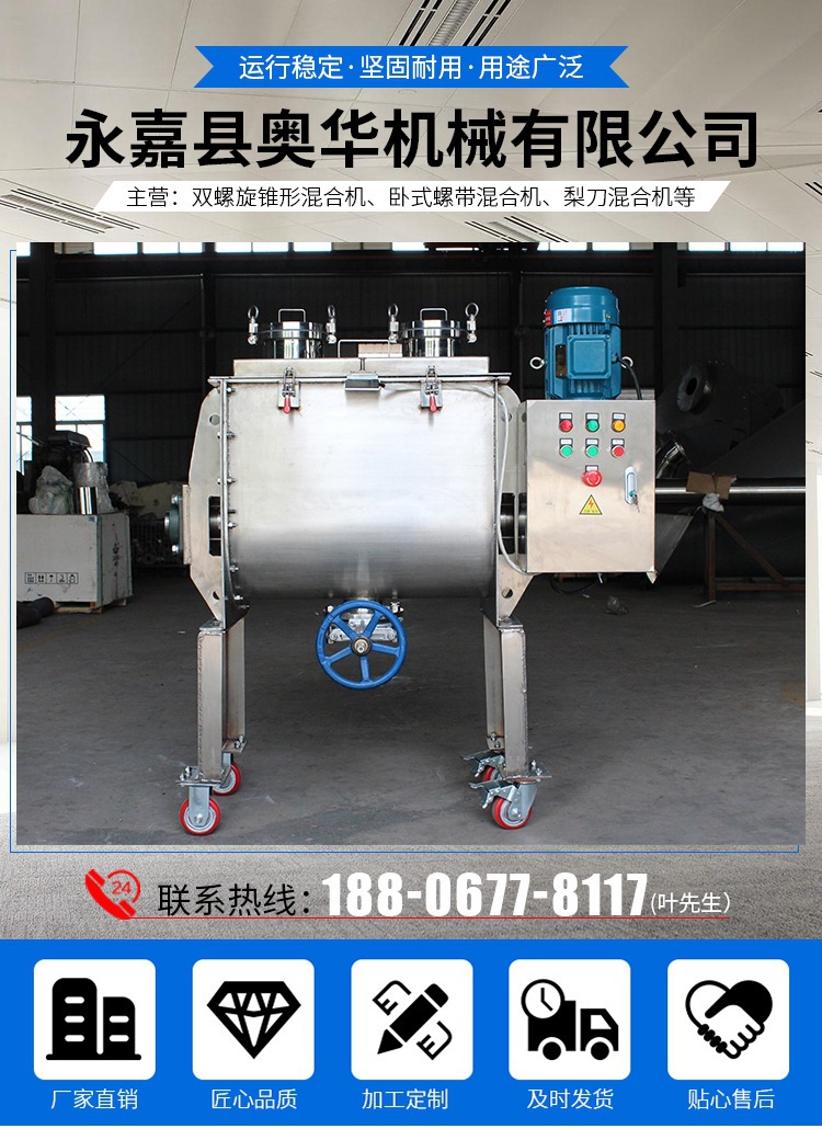 詳細信息 訂貨號1 應用領域食品,飼料,化肥等 貨號1 物料類型粉狀、粒狀物料 適用物料食品,飼料,化肥等 動力類型手動,氣動,電動 工作方式螺帶混合機 料筒運動方式二維 結構形式滾筒混合機 產品類型全新 品牌奧華 型號A