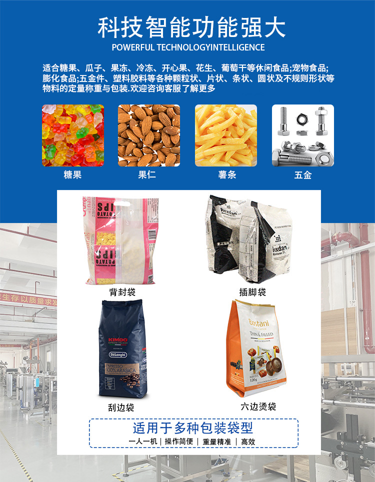 適用于五谷雜糧、堅果干果、糖果餅干、干貨炒貨、油炸膨化食品、冷凍食品等