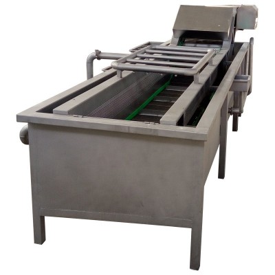 氣泡清洗機是利用漩渦氣泵產(chǎn)生的高壓氣流,通過浸入在水槽中的曝氣管產(chǎn)生的氣泡群對物料進行沖擊、按摩搓洗,防人工搓洗,將粘附在果蔬上的泥土、泥沙、植物桔梗、枝葉等雜物剝離、比重大體積小的異物在自身的重力作用下會沉到槽底,由排污口排出,比重小的漂浮物在水流和波動的推動下進入漂浮物撈取裝置,物料體積大的進入下道工序。