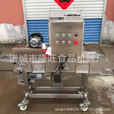 SXJ200上面包屑機與上漿機配合使用,亦可單獨使用。上面包屑機是通過下沾上撒的方式將面包屑均勻的裹涂在產品表面。