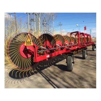 該機具與35馬力以上的拖拉機配套使用,適合于地勢平坦的地況上作業,對割倒晾曬后的牧草、苜蓿、小麥、大麥等作物秸稈進行摟集或翻曬作業。該機具主要由牽引梁總成、指盤總成、前后行走輪總成、主梁、液壓系統、U型梁、滑桿總成等部件組成,其結構合理、性能穩定,工作幅寬,有效提高 工作效率,摟集的草條寬度均勻,有利于捆草機撿拾作業,摟草損失率低,可以將草條翻轉過來或將多個草條合并成一個草條。