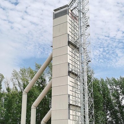 熱風(fēng)系統(tǒng)采用多臺風(fēng)機分段變溫烘干技術(shù)。剛?cè)胨募Z食由于水分大、溫度低,所以第一烘干段采用高風(fēng)溫、大風(fēng)量進(jìn)行急劇降水。這時熱風(fēng)效率非常高,飽和的廢氣被迅速排出塔外,提高烘干效率,達(dá)到增產(chǎn)目的。糧食進(jìn)入緩舒段進(jìn)行濕熱交換,表層的熱量向內(nèi)部傳導(dǎo),內(nèi)部的水分向表層移動,這樣能減少裂紋率,提高糧食品質(zhì)。進(jìn)入第二、三烘干段后,糧食溫度已達(dá)30℃以上,水分在20%以下,這時使用低溫烘干,可節(jié)省能量。冷卻段采用混逆流模式,糧食緩慢降溫,充分冷卻。