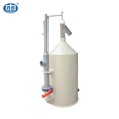 蛋白質(zhì)分離器是由離心旋流過濾裝置、十字布水裝置、反應(yīng)室、泡沫收集管、射流進(jìn)氣組件、底部排空、臭氧加注、出水及工作液位調(diào)整等部分組成,具體處理流程為:需要處理的水體在進(jìn)入離心旋流過濾裝置,在旋流離心力的作用下,大的顆粒物和細(xì)小的污物由旋流排污口排出(約進(jìn)水量15%),經(jīng)旋流過濾處理后85%水進(jìn)入十字布水裝置進(jìn)行均勻布水,布水后水緩慢流入反應(yīng)室,期間射流器裝置同時工作,吸入空氣,在水氣混合中產(chǎn)生大量微細(xì)氣泡。在水、氣、粒三相混合的體系中,不同介質(zhì)的相表面上都因受力不平衡而存在界面張力,當(dāng)微氣泡與固體懸浮顆粒接觸時,由于表面張力的作用就會產(chǎn)生表面吸附作用。微氣泡向上運動時,水中的懸浮顆粒和膠質(zhì)(主要是養(yǎng)殖生物的殘餌及排泄物等到有機物)便附著在微氣泡表面上,造成密度小于水的狀態(tài),利用浮力原理使其隨氣泡向上運動,并聚積在上部水面,隨著微氣泡的不斷產(chǎn)生,聚積的氣泡不斷推積到頂部的收集管中被排出。