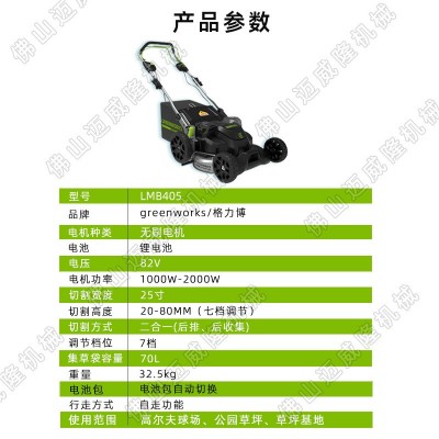 格力博LMB405自走電動(dòng)草坪車割草機(jī)草坪修剪機(jī) 82V大功率,質(zhì)保一年,全銅無刷電機(jī),7擋高度可調(diào),1000W-2000W大功率,帶大容量70L集草箱,25寸大范圍切割寬度。雙電池包自由更換持久續(xù)航,輕松工作。輕量材料,無線修整。