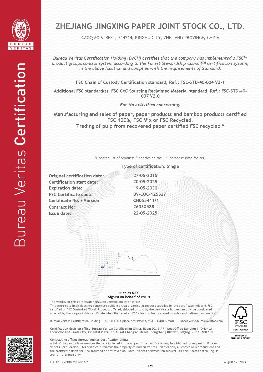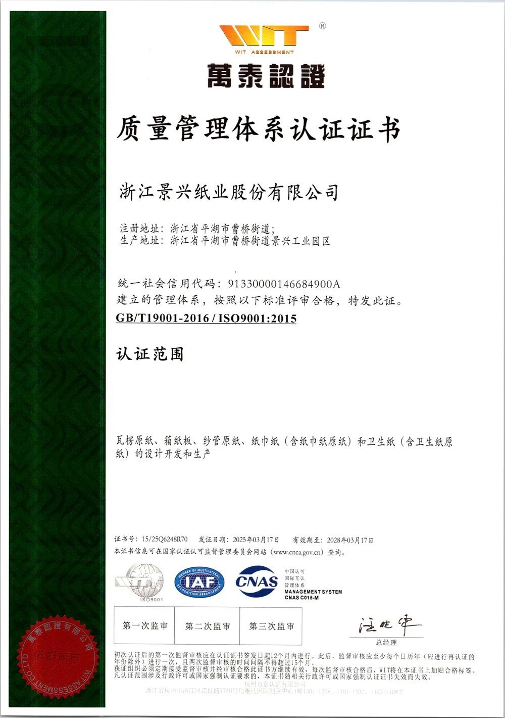 景興紙業(yè)于1996年率先在同行業(yè)通過ISO9001質(zhì)量管理體系認證,2002年通過ISO14001環(huán)境管理體系認證,2014年通過OHSAS18001職業(yè)健康安全管理體系認證,2015年通過GB/T23331能源管理體系和FSC?森林體系認證,2018年通過兩化融合管理體系認證。
